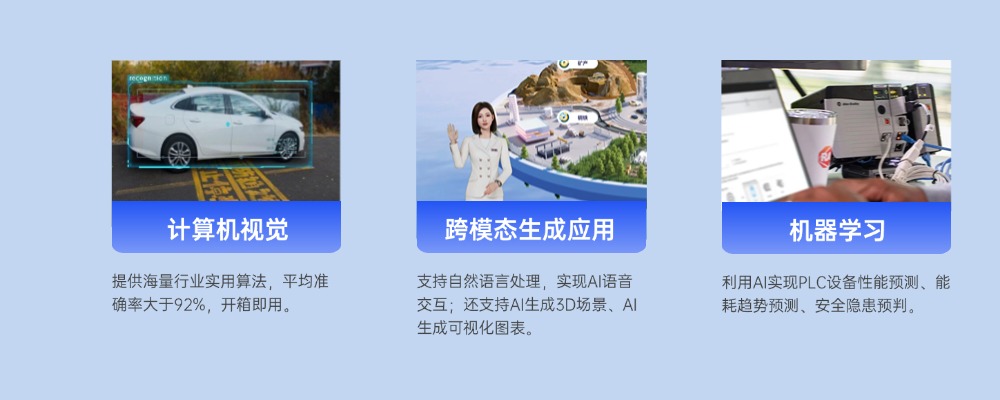 將AI應(yīng)用于多個業(yè)務(wù)場景,在計(jì)算機(jī)視覺層面,提供海量行業(yè)使用算法;在跨模態(tài)生成應(yīng)用層面,提供自然語言處理、AI生成3D場景、AI生成可視化圖表等;在機(jī)器學(xué)習(xí)層面,實(shí)現(xiàn)PLC設(shè)備性能預(yù)測、能耗趨勢預(yù)測、安全隱患預(yù)判等