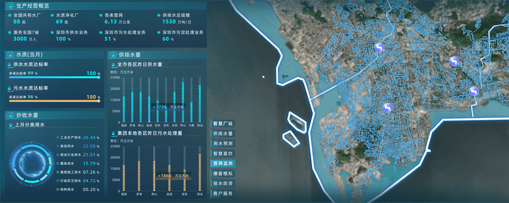 通過數(shù)據(jù)統(tǒng)一匯聚進(jìn)行的大數(shù)據(jù)可視化,實(shí)現(xiàn)水務(wù)行業(yè) “監(jiān)測(cè)、管理、服務(wù)”的智能化升級(jí)。