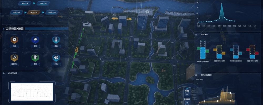 一圖總覽轄區(qū)內(nèi)降雨量和河湖水位、積水點(diǎn)和管網(wǎng)運(yùn)行水位、泵閘站運(yùn)行工況、搶險(xiǎn)車輛人員位置與工作情況,全面掌握應(yīng)急調(diào)度狀況,從整體到終端實(shí)現(xiàn)智能調(diào)度