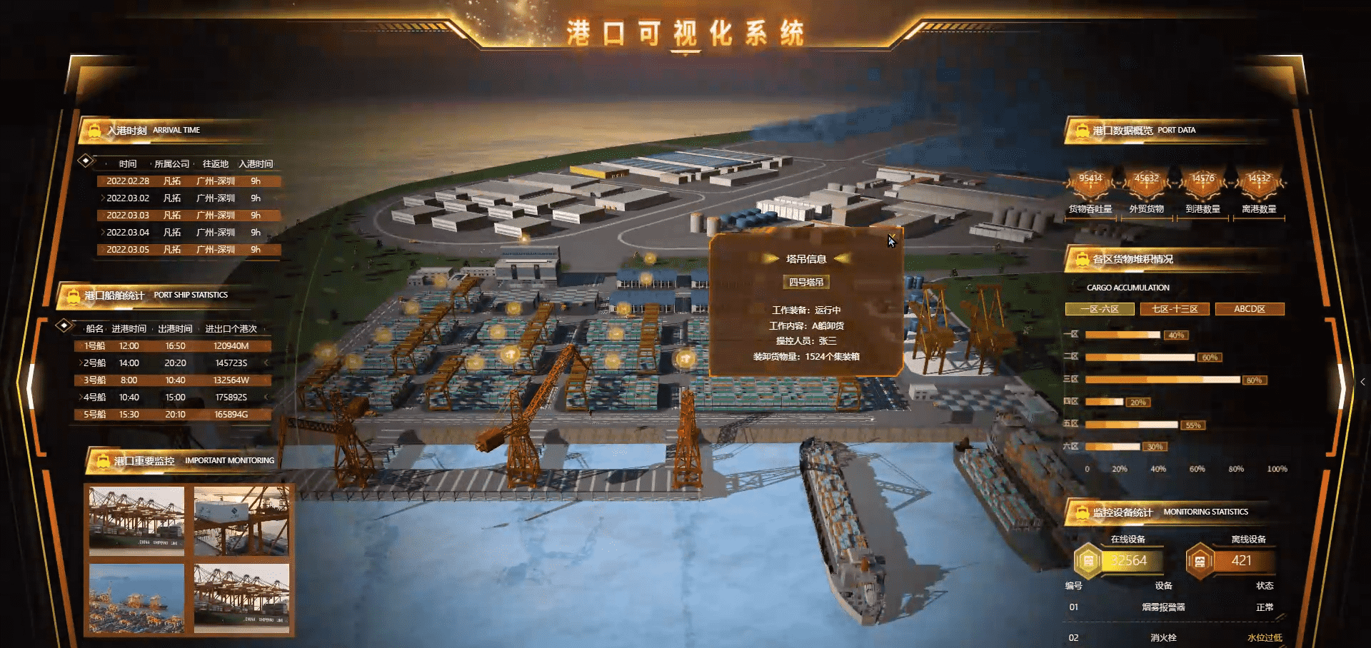 綜合呈現(xiàn)港口當(dāng)前天氣信息、泊位情況、船舶數(shù)量、機(jī)械設(shè)備狀態(tài)、人員數(shù)量、車輛數(shù)量等信息,同時(shí)顯示當(dāng)前的設(shè)備態(tài)勢(shì)、安防態(tài)勢(shì)、運(yùn)營態(tài)勢(shì)等宏觀數(shù)據(jù),統(tǒng)一管理,統(tǒng)一調(diào)度,助力港口運(yùn)行態(tài)勢(shì)全面感知
